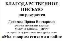 Педагог Денисова Ирина Викторовна совместно со своим учеником 1Г класса Гариповым Вадимом участвовали в муниципальном конкурсе чтецов, посвящённый 78-ой годовщине Великой Отечественной войне, где добились успеха.