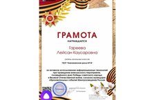 В канун Празднования Победы Великой Отечественной Войне, учитель начальных классов провела внеклассное мероприятие для 1 доп.класса, где дети с удовольствием просмотрели презентацию про Ветеранов ВОВ и своих дедушек. Этот материал отправили на сайт "Знанио" и Гареева Л. К. получила грамоту, за использование информационных технологий.