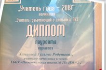 Дипломом лауреата на муниципальном этапе конкурса «Учитель года-2019» в номинации «Учитель, работающий с детьми с ОВЗ» наградили учителя начальных классов ГБОУ "Нижнекамская школа №18" Хамаеву Гульназ Робертовну.