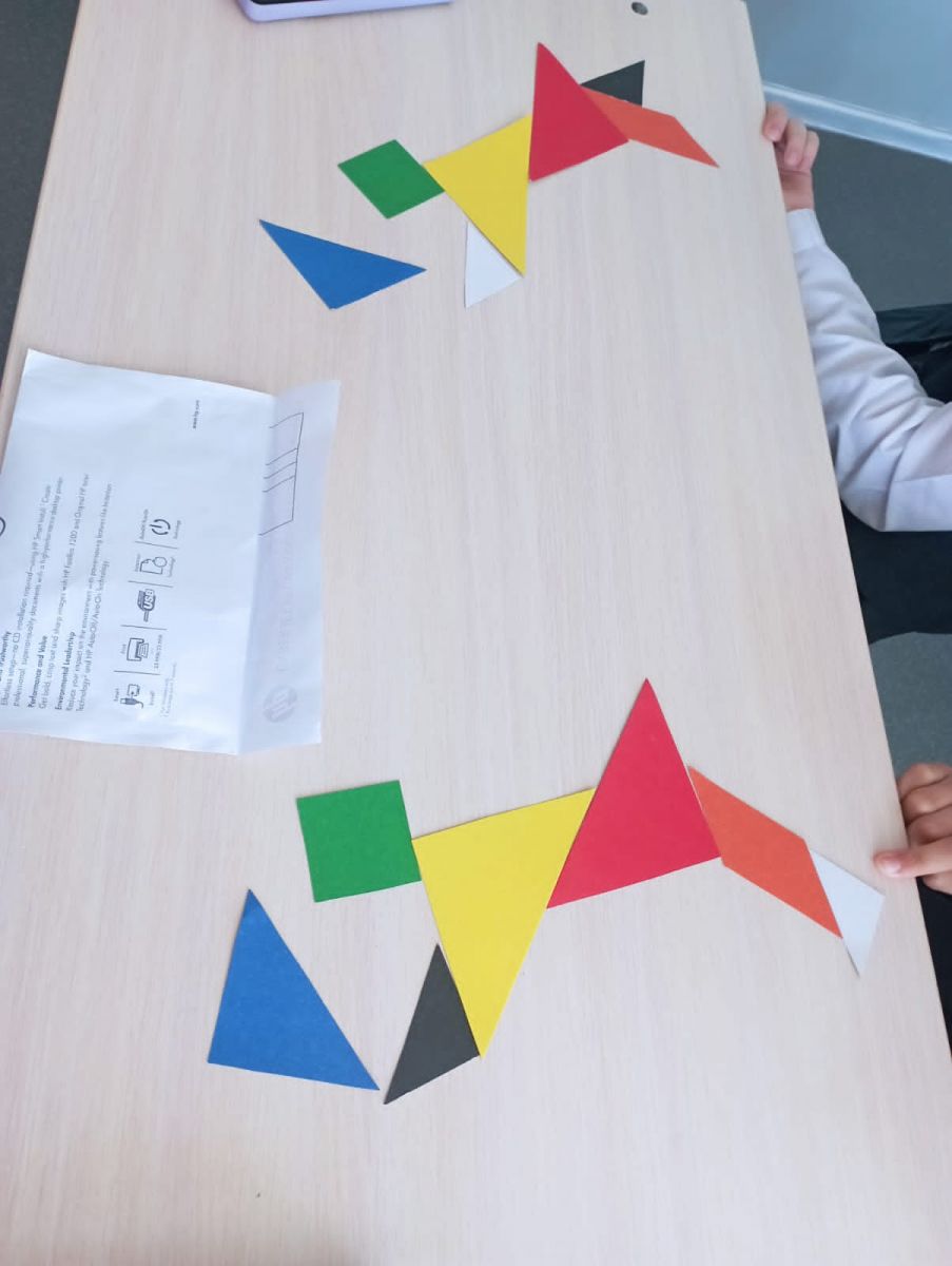 Опубликовано: 28.04.2022На внеурочном занятии по математике ученики 5 класса познакомились с игрой танграм, составляли фигуры по шаблонам, учились проявлять фантазию и составили Свои фигуры.