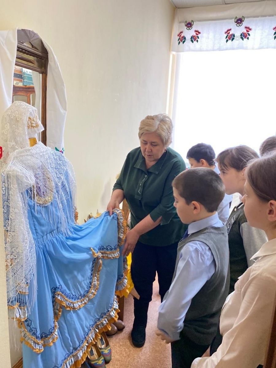 4 сыйныф җитәкчесе Гилязетдинова Н.Ф. балаларны Шәңгәлче мәдәният йортының музеена алып барды. Укучылар татар халык киеме, чиккән тастымаллар карадылар.
