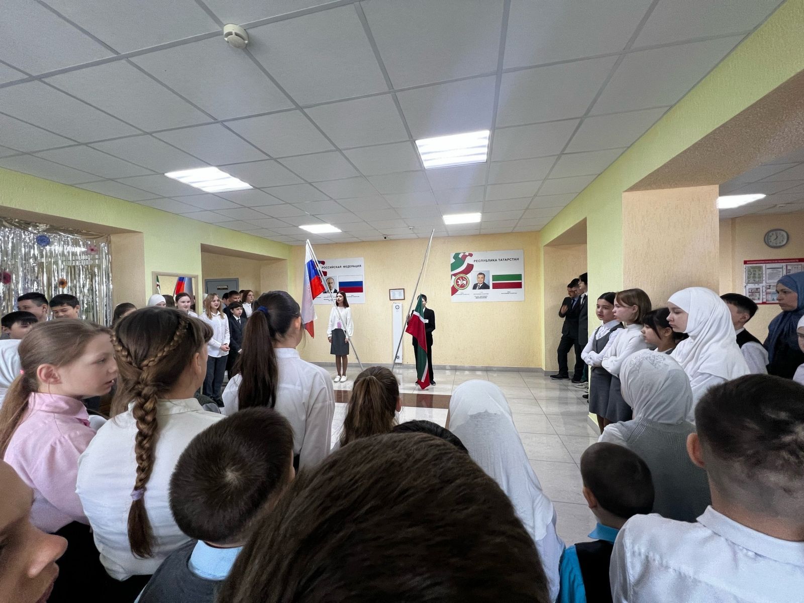 После окончаний весенних каникул проведена общешкольная линейка, на которой по традиции учащиеся и педагоги исполнили гимны России и Республики Татарстан.
