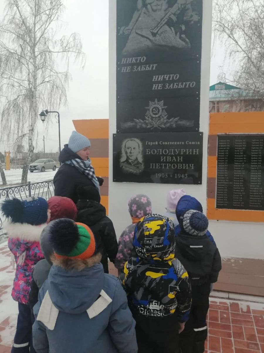 Сегодня воспитанники старшей и подготовительной к школе группы посетили мемориал в нашем селе. Дети узнали, о Герое села Болодурине иване Петровиче - герое Советского союза.