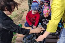 В рамках экологической акции "Преображение" сотрудники и дети детского сада "Сказка" посетили пруд посёлка и собрали мусор и сухие ветки вдоль берега. -