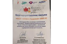 28.11.2023 г. в МБОУ "Лицей# 38" НМР РТ состоялось награждение организаций принявших участие в акции "Осенняя неделя добра". Наша школа была награждена Благодарственным письмом. -