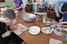 Сегодня Тузеева Т. П. с учащимися 8 класса провела мастер - класс. Основная цель занятия: удовлетворять потребность детей быть самостоятельными, научить печь блины. На первом этапе дети угадывали название занятия, собирали пазл блина. Затем отгадывали загадки об ингридиентах блинного теста. В ходе занятия поговорили с ребятами откуда берётся мука и почему поднимается тесто, как пекли хлеб в давние времена. Каждый ребёнок принял участие в приготовлении теста и попробовал испечь блин . После занятия ребята с удовольствием пили чай с приготовленными ими блинами.