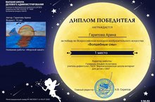 Поздравляем победителей Всероссийского конкурса рисунков "Волшебные сны" - Гарипову Арину ( 1 место) , Антонова Вову (2 место). Молодцы ребята!