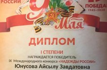 Поздравляем победителя IX Международного конкурса "Надежды России" Юнусову Айсылу, ученицу 9 класса . Ею была отправлена работа "Бессмертный полк шагает по планете!" (номинация: Великой Победе - 75") - Диплом I степени (рук. Гилазиева Ф.Д.).