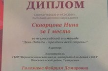 Скворцова Нина, ученица 9 класса дистанционно принимала участие во Всероссийской олимпиаде "День Победы - праздник всей страны!" - Диплом I степени (рук. Гилазиева Ф.Д.).