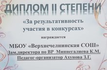 "Центр детского творчества "Радуга" награждает МБОУ "Верхнечелнинская СОШ" НМР РТ Дипломом II степени "За результативность участия в конкурсах".