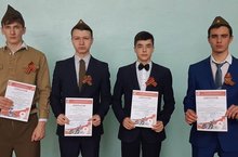 Галиев Камил (10 кл.), Хамидуллин Рәмис (11 кл), Ягудин Муса (8 кл.) һәм Валиуллин Әмир (11 кл.) Җиңүнең 75 еллыгына багышланган "Смотр строя и песни" ярышы буенча зональ этапта катнаштылар. Галиев К. һәм Хамидуллин Р. Ватан тарихын белү буенча икенче дәрәҗә диплом белән бүләкләнделәр. Турникта күтәрелүдә команда 3 урынны алды. Афәрин, егетләр! -