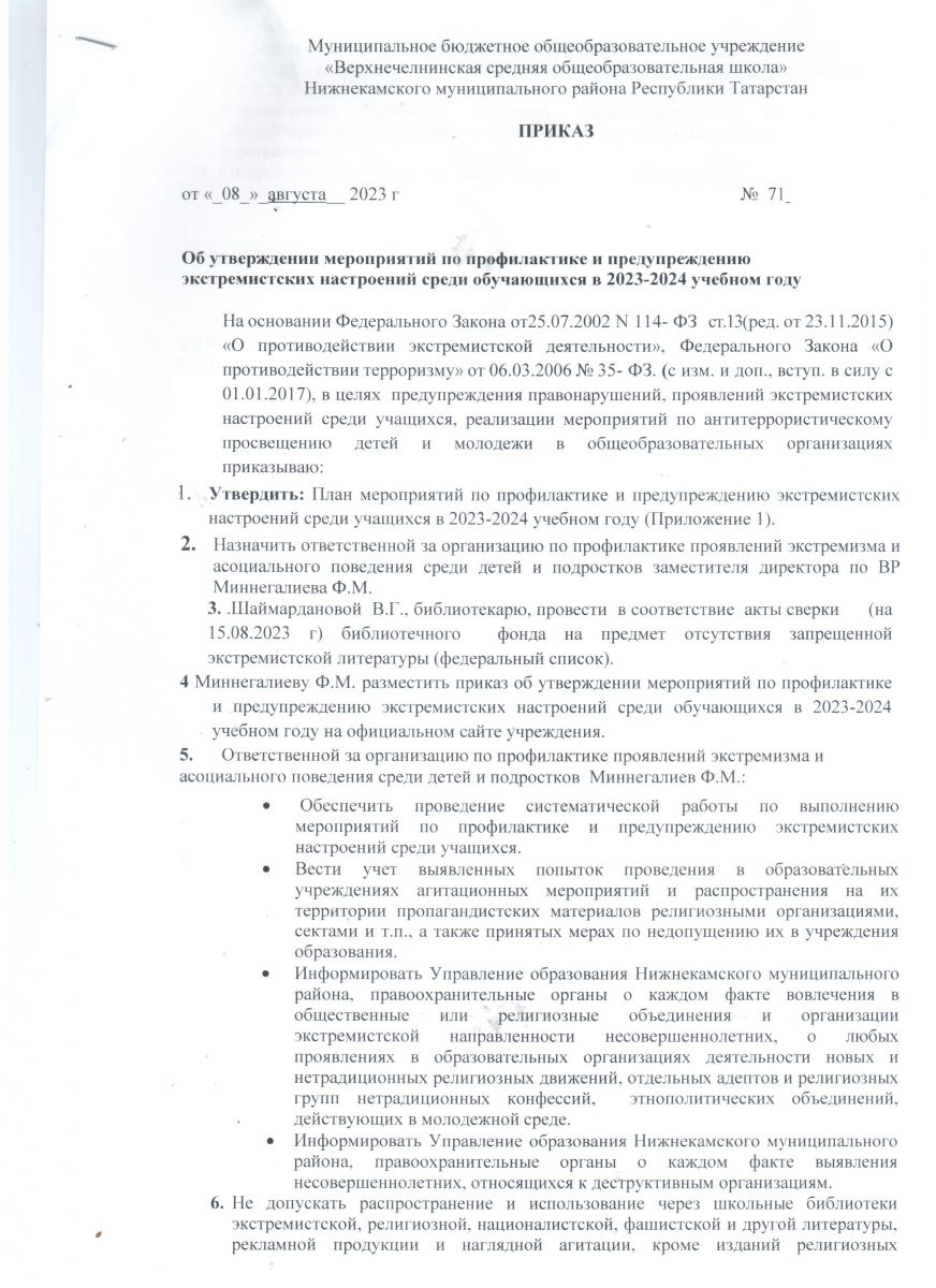 Приказ об ответственном за профилактику экстремизма на 2023-2024 учебный год