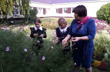 Занятие кружка "Зеленая архитектура" под руководством Нины Анатольевны Шуруповой. Ребята собирали семена цветов на школьном цветнике.