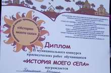 Учащиеся 8 класса приняли участие в муниципальном конкурсе краеведческих работ "История моего села". Пашанин Даниил занял третье место в номинации "Подвигом славны мои земляки", Чебурахтин Егор стал лауреатом в номинации " История колхозов и совхозов НМР". Руководитель кружка "Краеведение" Лушнова Р.В.