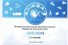Учащиеся начальных классов приняли активное участие в муниципальном конкурсе рисунков и поделок "Профессия моих родителей". Ученица 1 класса Конкова Вероника награждена дипломом I степени в номинации "Семейная поделка" (руководитель Корышкина Н.П.), учащиеся 4 класса Романов Сергей - дипломом II степени в номинации "Семейная поделка" и Пашанин Даниил - дипломом III степени в номинации "Семейный рисунок" (руководитель Анисимова З.И.)