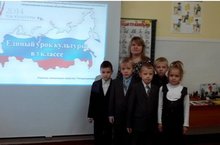 12 ноября 2014 года учитель начальных классов Петрунникова С.П. провела Единый урок культуры в 1 классе. Целью занятия являлось привлечение внимания обучающихся к вопросам развития культуры, сохранение культурно- исторического наследия и роли российской культуры во всем мире. Дети учились ставить цели, находить пути их достижения, делать выводы, культурно общались, сотрудничали в различных видах деятельности. Светлана Павловна познакомила обучающихся с разными высказываниями известных людей о культуре, видами и областями культуры, ввела понятие о культуре, учила детей видеть красоту культурного наследия России, а так же прививала интерес и любовь к культуре. У первоклассников развивались воображение, мышление и речь. На уроке была использована презентация. В конце занятия учащимся было предложено проверить то, что сегодня узнали, ребята отгадывали кроссворд.