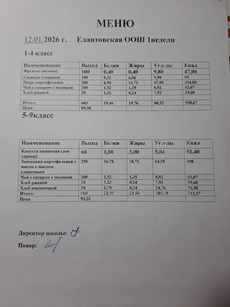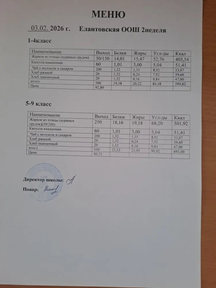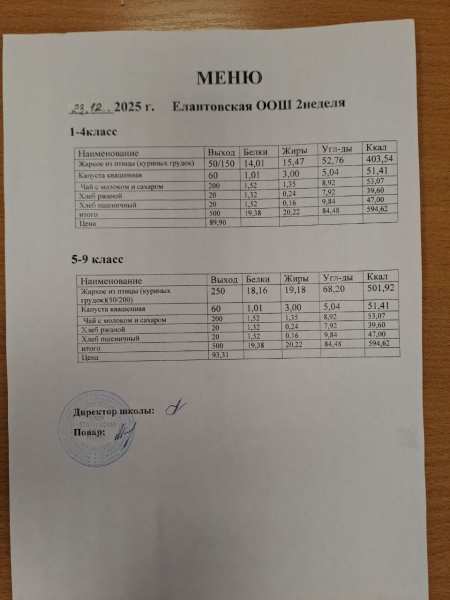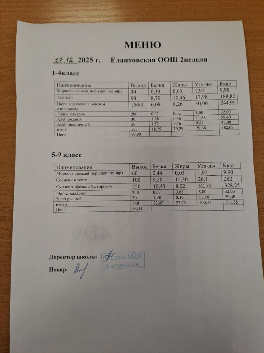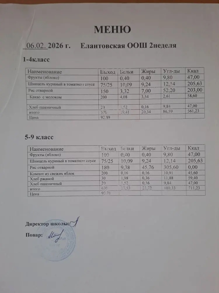 Двухнедельное меню для 1-4 классов c 1 сентября 2025 г.