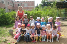 Воспитатели и наши детки в этот жаркий прекрасный день гуляют на улице и принимают солнечные ванны.