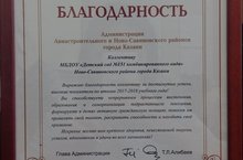 Наш коллектив получил благодарность от главы Администрации Авиастроительного и Ново-Савиновского района. За достигнутые успехи и высокие показатели по итогам 2017-18 учебного года. Тимур Лазович Алибаев благодарит коллектив за формирование в детях активной гражданской позиции, за помощь детям в проявлении талантов, за раскрытие способности находить свое призвание. По итогам работы коллектива детский сад занимает второе место в городском рейтинге среди детских садов города Казани.
