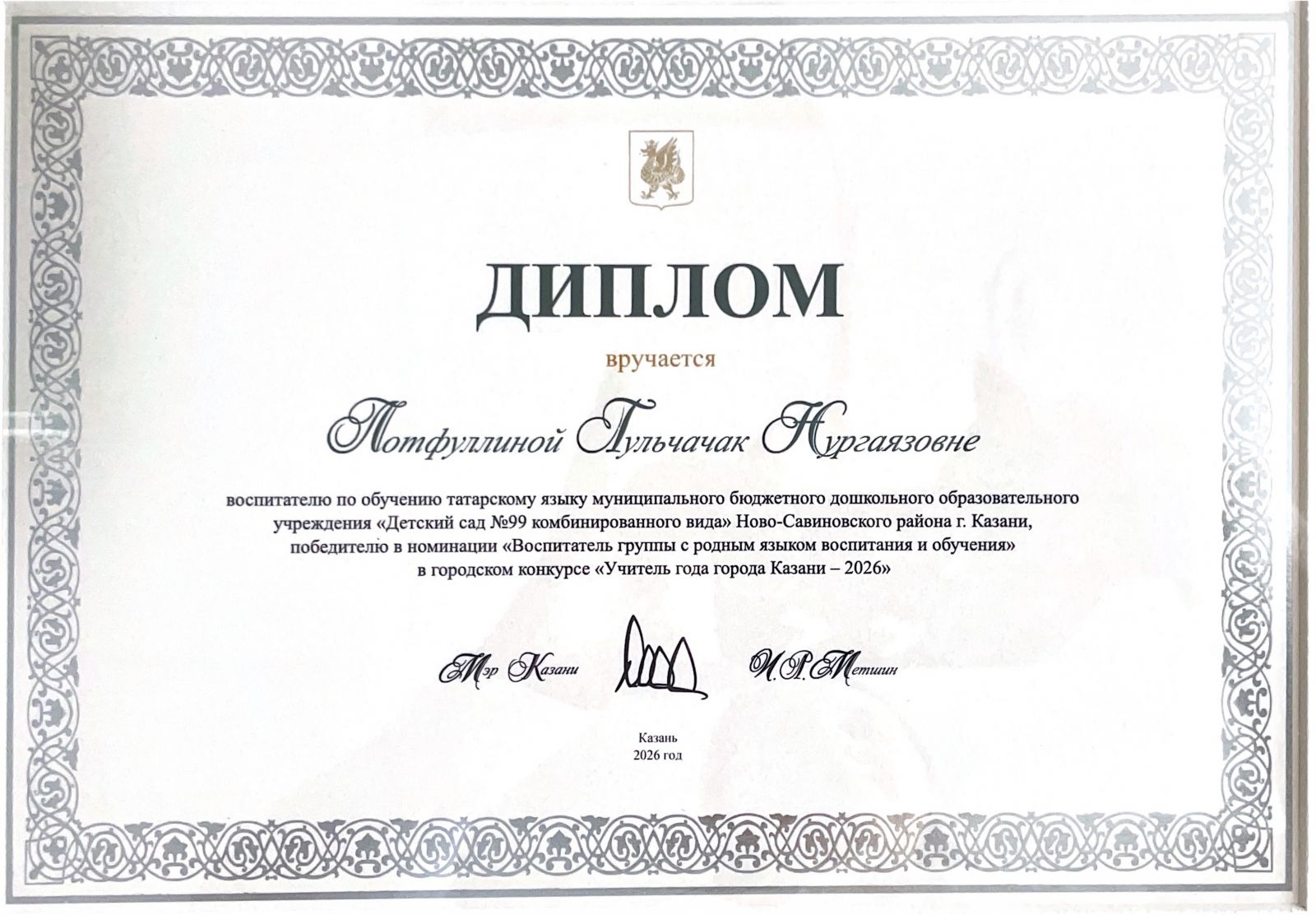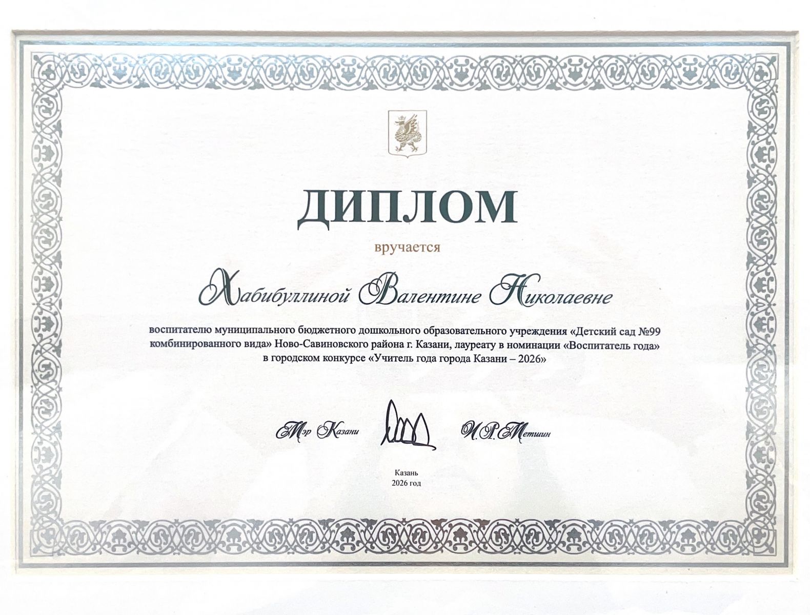 В казанской Ратуше состоялась церемония награждения участников конкурса «Учитель года Казани – 2026».Победителей поздравил и вручил награды мэр Казани Ильсур Метшин.«Вы двигаете вперед систему казанского образования новаторскими подходами, даете детям знания и воспитываете подрастающее поколение в духе традиционных ценностей. Именно учитель помогает разглядеть в каждом ребенке его индивидуальность и развить сильные стороны», – обратился к собравшимся на церемонии педагогам градоначальник.Победителей конкурса выбирали в 11 номинациях: «Учитель – предметник», «Учитель татарского языка и литературы», «Педагогический дебют», «Ветеран-педагог», «Мастер инклюзивной педагогики», «Воспитать человека», «Сердце отдаю детям», «Педагог – психолог», «Учитель года по предмету «Основы безопасности и защиты Родины»», «Воспитатель группы с родным языком воспитания и обучения» и «Воспитатель года».В городском этапе конкурса приняли участие педагоги, ставшие победителями и призёрами районных туров.Лотфуллина Гульчачак Нургаязовна Победила в номинации «Воспитатель группы с родным языком воспитания и обучения»Хабибуллина Валентина Николаевна стала Лауреатом в номинации "Воспитатель года"Гордимся нашими педагогами и желаем им творческих успехов!