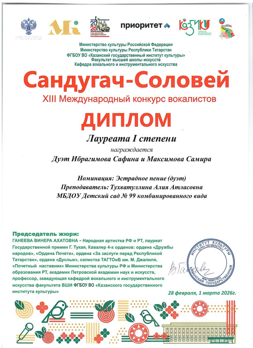 28 февраля состоялся XIII Международный конкурс вокалистов "Сандугач-Соловей". В конкурсе приняли участие наши талантливые воспитанницы подготовительной группы №13 - Ибрагимова Сафина и Максимова Самира. Под руководством музыкального руководителя Алии Атласовны, были подготовлены музыкальные песенные номера, в результате конкурса, среди многочисленных участников, девочки заняли призовые места! Поздравляем наших воспитанниц и педагога, желаем дальнейших успехов!