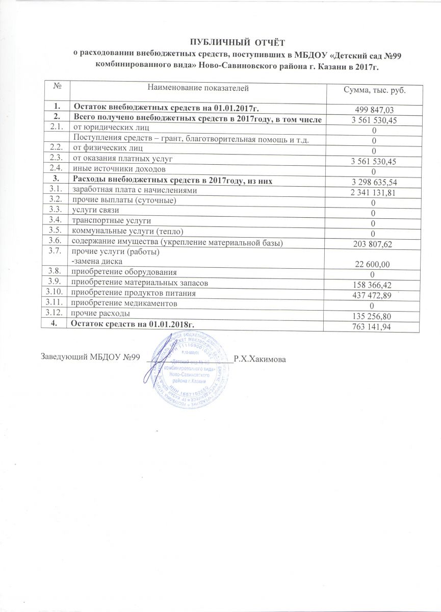 Отчет о привлечении и расходовании внебюджетных средств, поступивших в МБДОУ "Детский сад №99 комбинированного вида" в 2017году