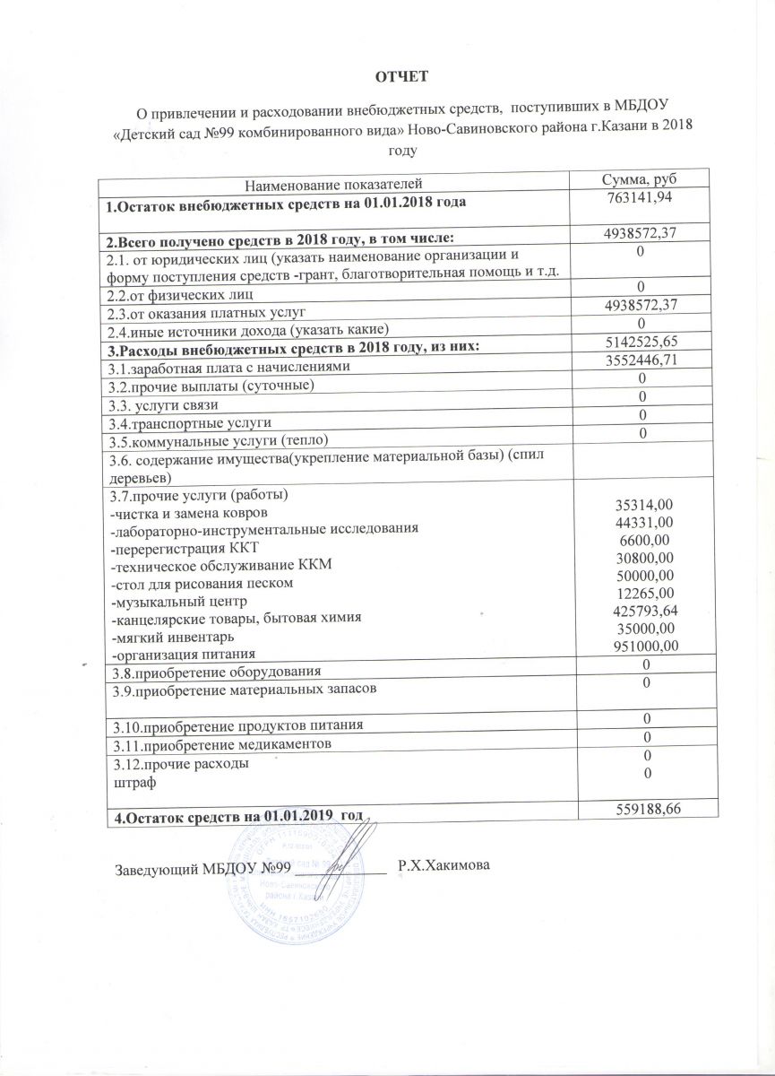 Отчет о привлечении и расходовании внебюджетных средств, поступивших в МБДОУ "Детский сад №99 комбинированного вида" в 2018году