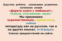 Дорогие ребята, уважаемые родители! Начинаем акцию "Дарите книги с любовью!". Станьте участниками акции! Мы принимаем художественную, справочную, учебную литературу как на русском, так и на других языках с 14 по 18 февраля. Список предпочтений по ссылке.