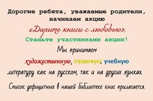 Дорогие ребята, уважаемые родители, начинаем акцию «Дарите книги с любовью». Станьте участниками акции! Мы принимаем художественную, справочную,учебную литературу как на русском, так и на других языках.