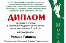 Поздравляем нашу звёздочку Галиеву Ралину и её наставников с дипломом лауреата II степени в номинации "Художественное слово" среди участников от 2 до 7 лет на IVРеспубоиканском патриотическом конкурсе "Красная ромашка" среди детей дошкольного и школьного возраста посвящённый 120-летию со дня рождения героя Советского Союза, поэта Мусы Джалиля ссылка на публикацию в ВК https://vk.com/wall-211638612_1023