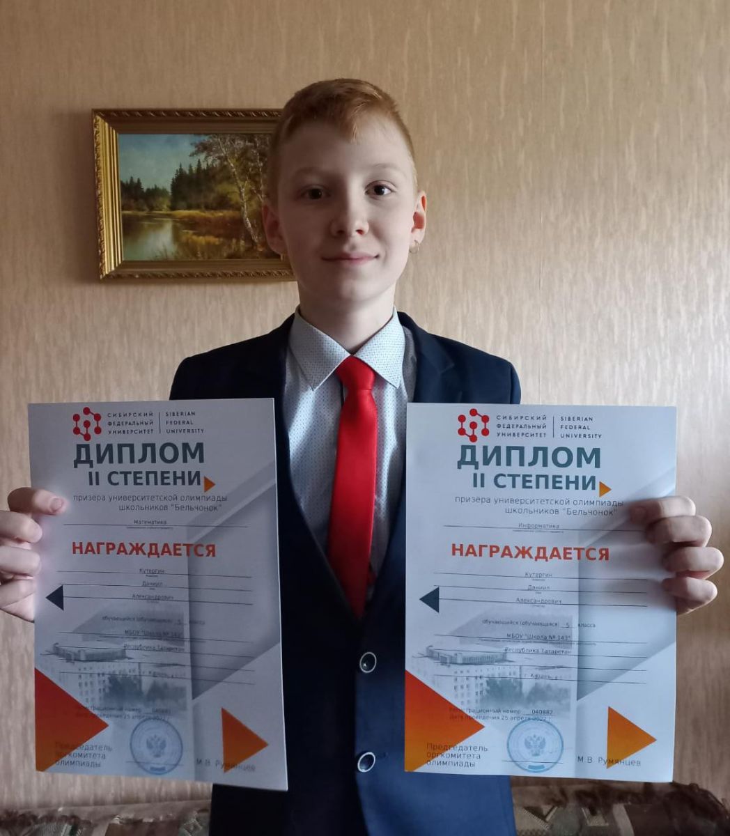 Поздравляем ученика 5"Б" класса,Кутергина Даниила с ПОБЕДОЙ-Дипломы 2 степени по информатике и математике в университетской олимпиаде школьников"Бельчонок".