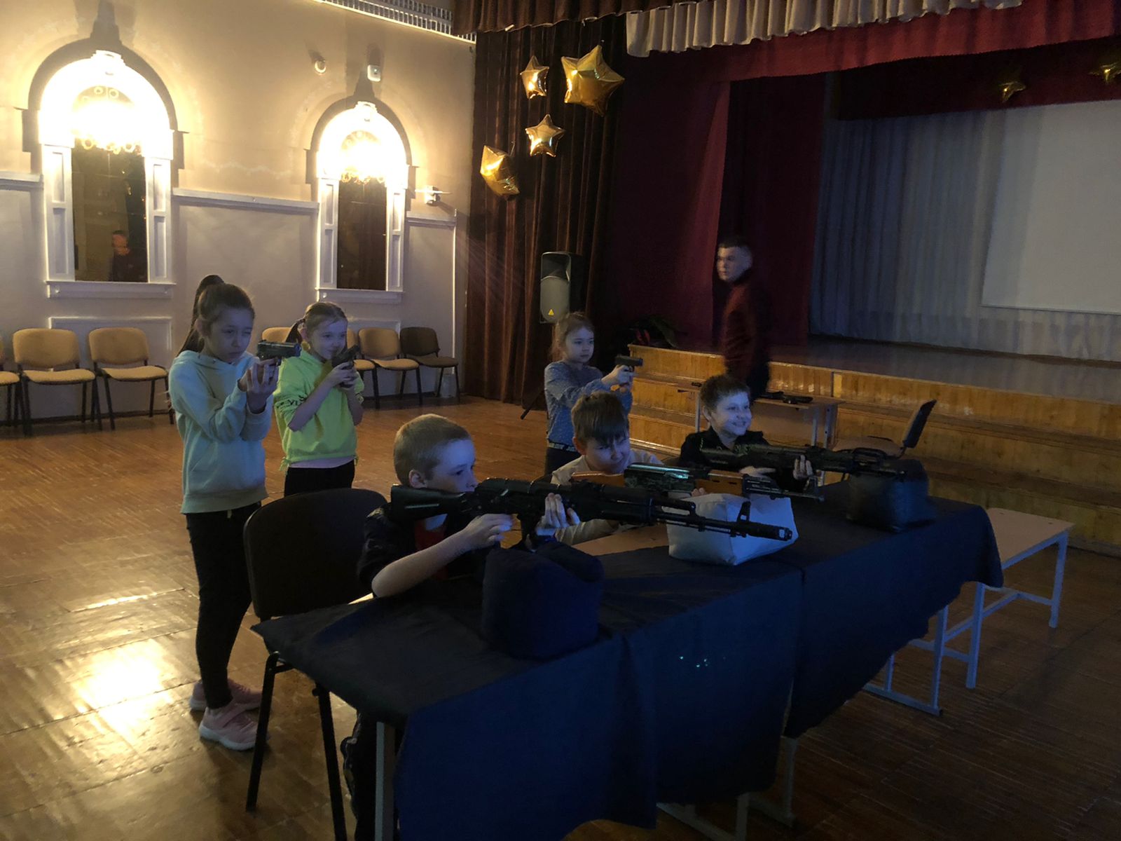 Сегодня для ребят была организована технически оборудованная комната - интерактивный тир. Что же это такое? Инструктор загружает специальную программу в компьютере, изображение выводится на интерактивную доску. Далее выбирается упражнение - это может быть стрельба по статичным или подвижным мишеням.Ребята получили незабываемые впечатления. Ведь тир - это место , где можно развить в себе потрящающую меткость и ловкость.