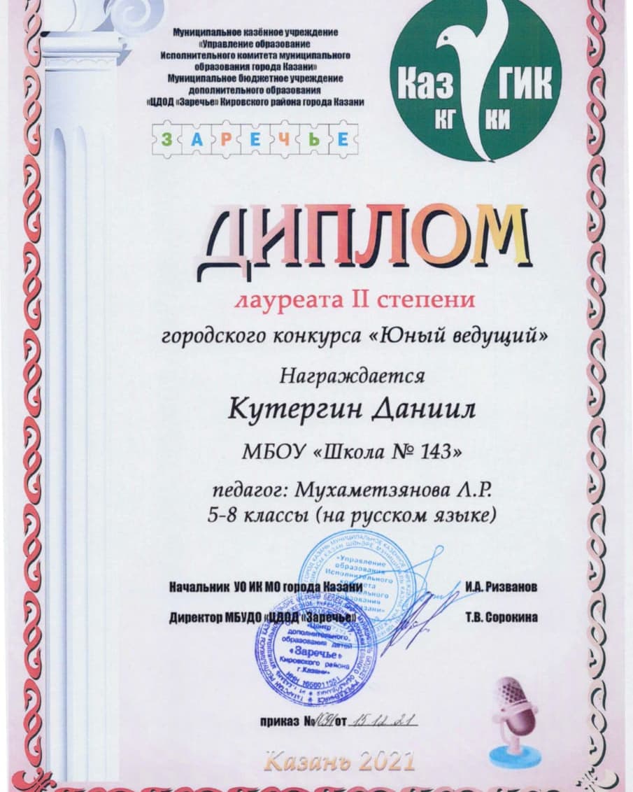 Поздравляем ученика 5"б" класса, Кутергина Даниила С ПОБЕДОЙ -Лауреат 2 степени
