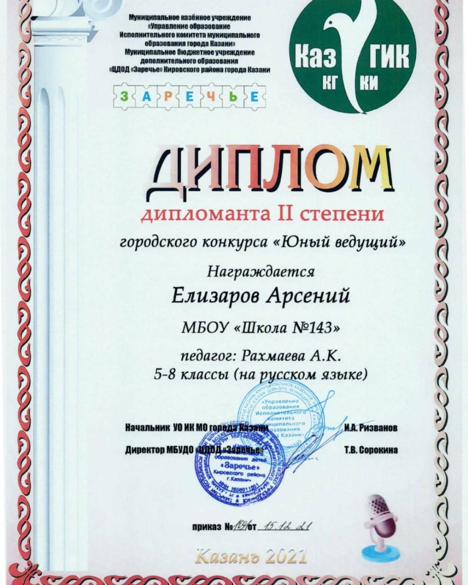 Поздравляем ученика 6"а" класса, Елизарова Арсения С ПОБЕДОЙ дипломант 2 степени