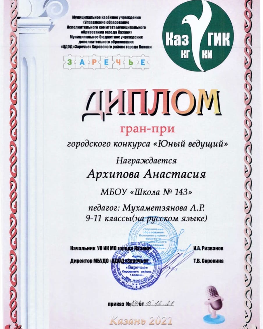 Поздравляем ученицу 9"а" класса, Архипову Анастасию С ПОБЕДОЙ-ГРАН ПРИ.