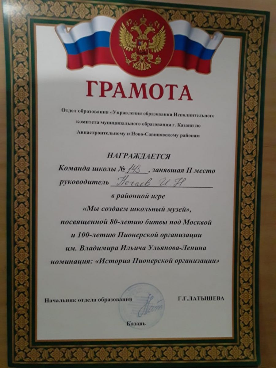Поздравляем команду нашей школы с ПОБЕДОЙ-2 место в районной игре:"Мы создаем школьный музей",посвящённой 80-летию битвы под Москвой и 100-летию Пионерской организации им. Владимира Ильича Ульянова-Ленина в номинации:"История пионерской организации ".