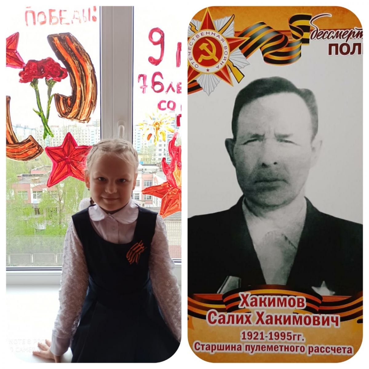 Ученица 1"А" класса, Шарафутдинова Камила гордится своим прадедом Хакимовым Салихом Хакимовичем и принимает участие в акции "10 дней до Победы" "Бессмертный полк ".