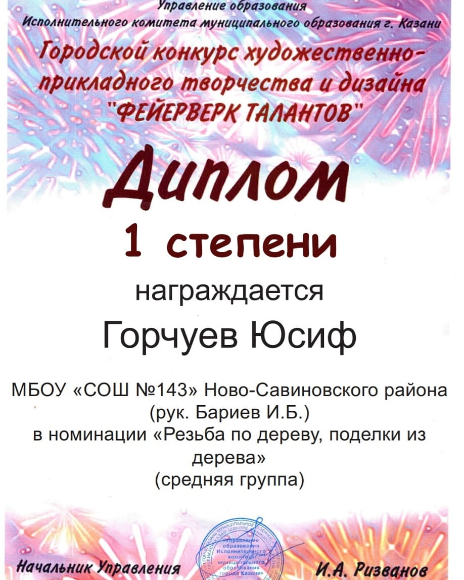 Поздравляем ученика 6 "Б" класса Горчуева Юсифа и его руководителя Бариева Ильгизар Башировича с ПОБЕДОЙ в городском конкурсе "Фейерверк талантов".