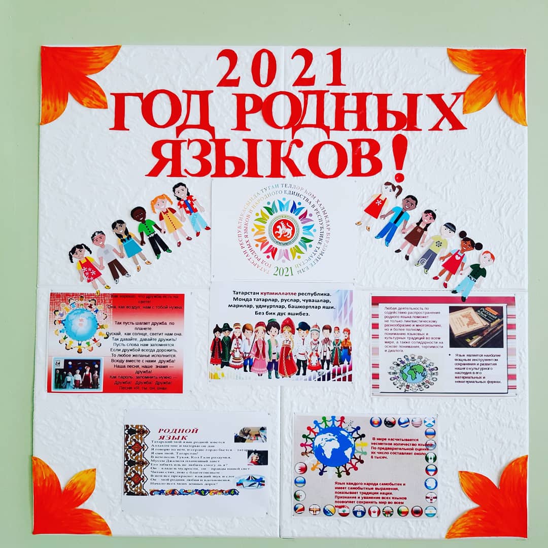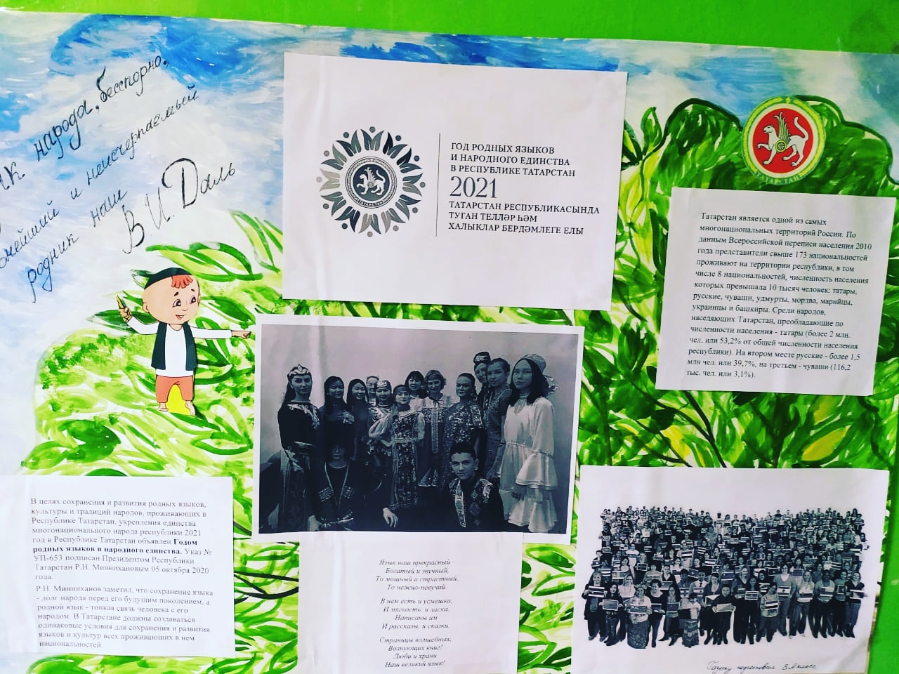 Классный уголок 9 "Б" класса,посвящённый "Году родных языков и народного единства".В целях сохранения и развития родных языков, культуры и традиций народов, проживающих в Республике Татарстан, укрепления единства многонационального народа республики 2021 год в Республике Татарстан объявлен Годом родных языков и народного единства. Указ № УП-653 подписан Президентом Республики Татарстан Р.Н. Миннихановым 05 октября 2020 года.