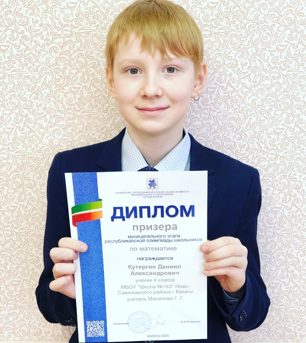 Ученик 4 "Б" класса Кутергин Даниил, призёр муниципального этапа республиканской олимпиады школьников.