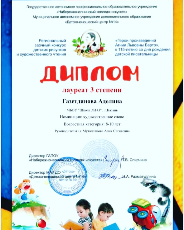 Поздравляем с ПОБЕДОЙ- ученицу 3 "Г" класса Газетдинову Аделину в номинации "Художественное слово" Регионального заочного конкурса детских рисунков и художественного чтения.
