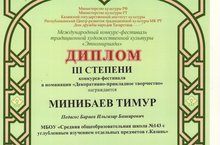 Ученик 9А класса Минибаев Тимур стал призёром 3 степени в Международном конкурсе-фестивале традиционной художественной культуры "Этномириада" в номинации "Декоративно-прикладное творчество".