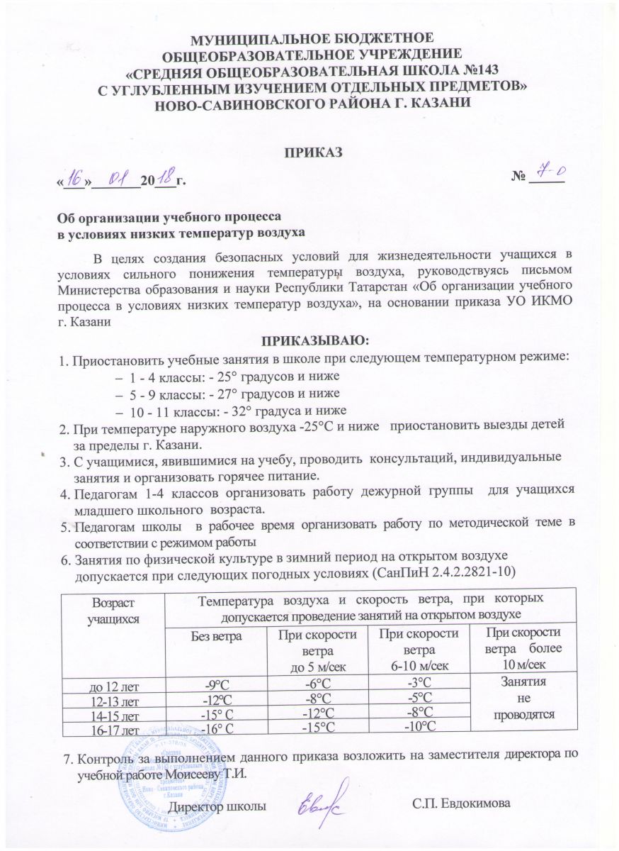 Организация учебного процесса в условиях низких температур воздуха
