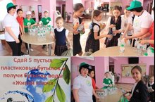 20 апреля 2018 года в нашей школе прошла акция «Чистая окружающая среда - чистая вода», организованная отрядом «Эковолонтёры» 3Б класса (руководитель Набиуллина Р.А.). За пять сданных пустых пластиковых бутылок можно было получить у волонтёров бутылку воды «Живой ключ». Благодаря проекту по раздельному сбору мусора и акции «Чистая окружающая среда - чистая вода», в школе сегодня вы не найдёте ни одной пустой пластиковой бутылки! И получается, что итог акции можно выразить в перевёрнутом лозунге акции – «Чистая вода – чистая окружающая среда»!