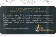 В благодарственных словах за содействие в организации и проведении конкурса 2017 года отмечается бесценность доброй и великодушной профессиональной помощи, которую Диляра Салиховна оказывает коллегам - директорам школ России.