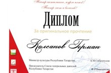 Колсанов Германны, югары дәрәҗәдә үткәрелгән Халыкара сәнгатьле уку бәйгесе конкурсында катнашып, “Үзенчәлекле, үзенә бер төрле,бүтәннәргә охшамаган ”уку номинациясендә җиңеп чыгуы белән котлыйбыз.
