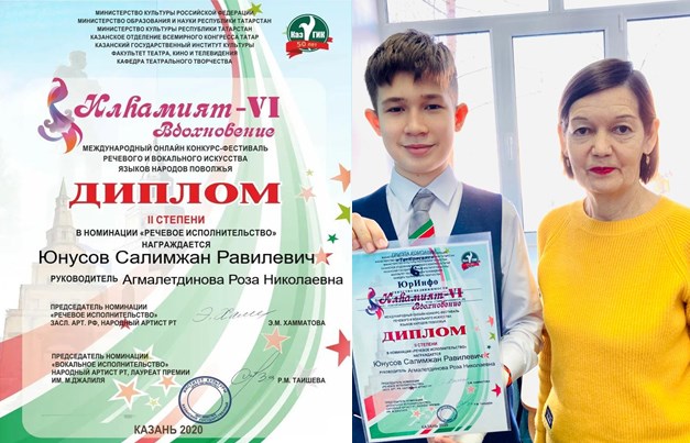 На международном конкурсе «Илhамият-Vl (Вдохновение) Юнусов Салимжан (руководитель Агмалетдинова Роза Николаевна) был награждён дипломом ll степени в номинации «Речевое исполнительство».Йонысов Сәлимҗан Халыкара "Илhамият" бәйгесенең "сәнгатьле уку" номинациясендә ll дәрәҗәдәге дипломга лаек булды.