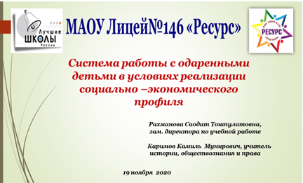 19 ноября 2020 г. для заместителей директора по учебной работе и учителей школ Ново – Савиновского района был проведен вебинар на тему «Система работы с одаренными детьми в условиях реализации социально-экономического профиля»
