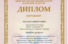 Поздравляем ученицу 9 В класса, Муллагалиеву Раяну со 2 призовым местом на региональном этапе Всероссийского конкурса юных исследователей окружающей среды в номинации "Экология и здоровье человека". Выражаем огромную благодарность научным руководителям, Сергеевой С.В. и Обуховой В.В. за подготовку юных ученых, верим, что за ними великие открытия.
