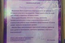 За помощь и активное участие в новогоднем шоу на воде для детей и взрослых "Страна снов" в лице Марии Киселевой, автора и художественного руководителя, 3-х кратной олимпийской чемпионки по синхронному плаванию, выражается благодарность ученику - Хайруллину А.